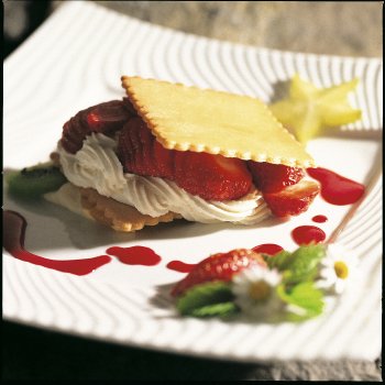 Entre deux carrés de Salers, déposer une cuillère à soupe de crème et quelques fruits.